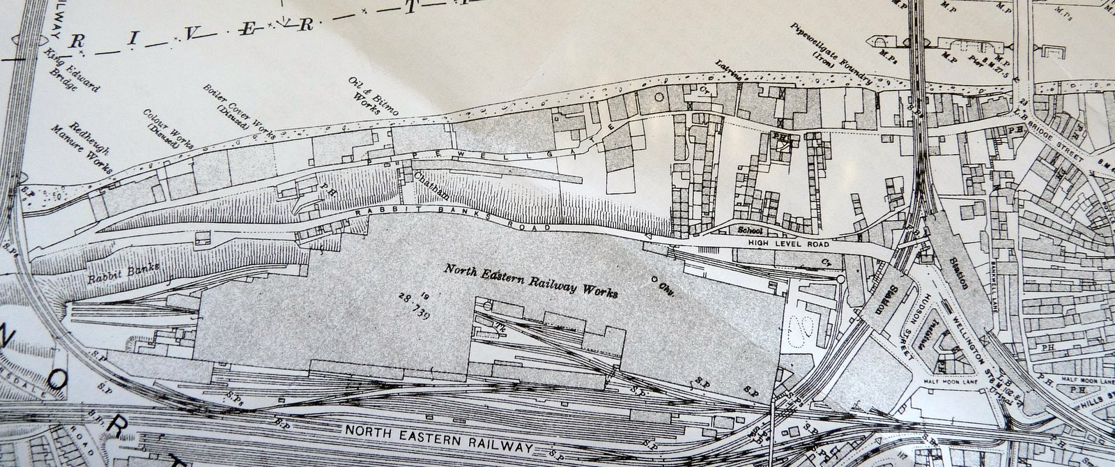 Starting at the left you will see the road Pipewellgate which extends the entire length passing below the High Level Bridge and finishing at Bridge Street at the old Riverside Police Building. You will also see Rabbit Banks Road which further along towards the High Level Bridge becomes High Level Road