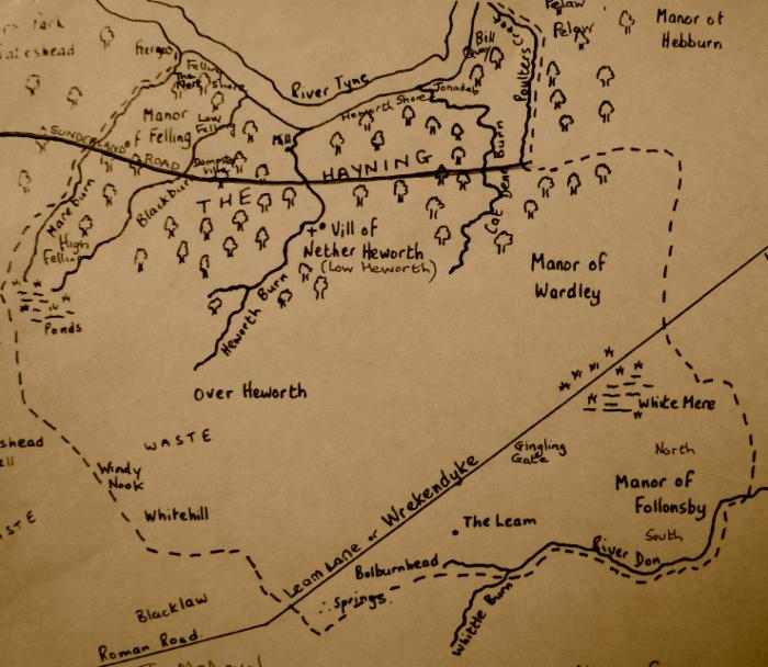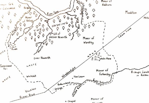 White Mere ( and White Mare Pool..modern name) and just further south on the Wrekendyke Road is Gingling Gate. The Manor of Wardley is shown on the above map where is found, on the ground, not on the map, Lingy Lane, Wardley Colliery, North Wardley, South Wardley, Manor Farm, Woodbine House and Wardeley.