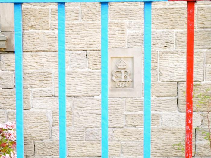 Two pics so you don't make the same mistake as I did. I went looking for it and looked high up on the wall. There's a big cartoon bear carrying balloons and I assumed the royal cypher must be under it. I was wrong. I was told by local historian Marie that it's still on full view but way down below the fence line. Just so there's no doubt here's a little video showing its exact location