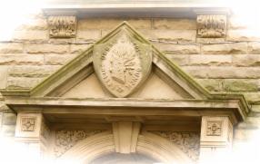 Above the main door is a crest which was adopted by the Council but was originally the crest of the Brandling family, lords of the manor since the 16th century. The crest comprises an oak log with leaves and acorns attached, and flames coming out the top. Left click the above image to see the detail of the crest