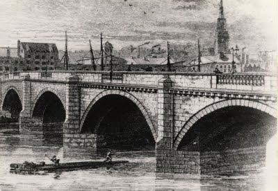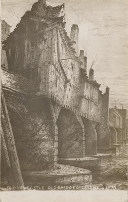 Here's the bigger picture and left click to see it bigger. There may have been more than one bridge at Newcastle in the middle ages but the first of which anything is known was probably built in the late 12th century replacing a bridge destroyed by fire in 1248. This was a stone arched bridge with huge piers built on the site of the Roman bridge and was a joint enterprise between Newcastle and the Bishop of Durham and the Bishop's arms appeared on a tower at the Gateshead (in County Durham) end of the bridge. Towers with gates and a drawbridge and portcullis reflected the bridge's military significance and a chapel was a feature not unusual for the times. A prison was also incorporated and several shops and houses, particularly at the Gateshead end, completed its picturesque appearance.
